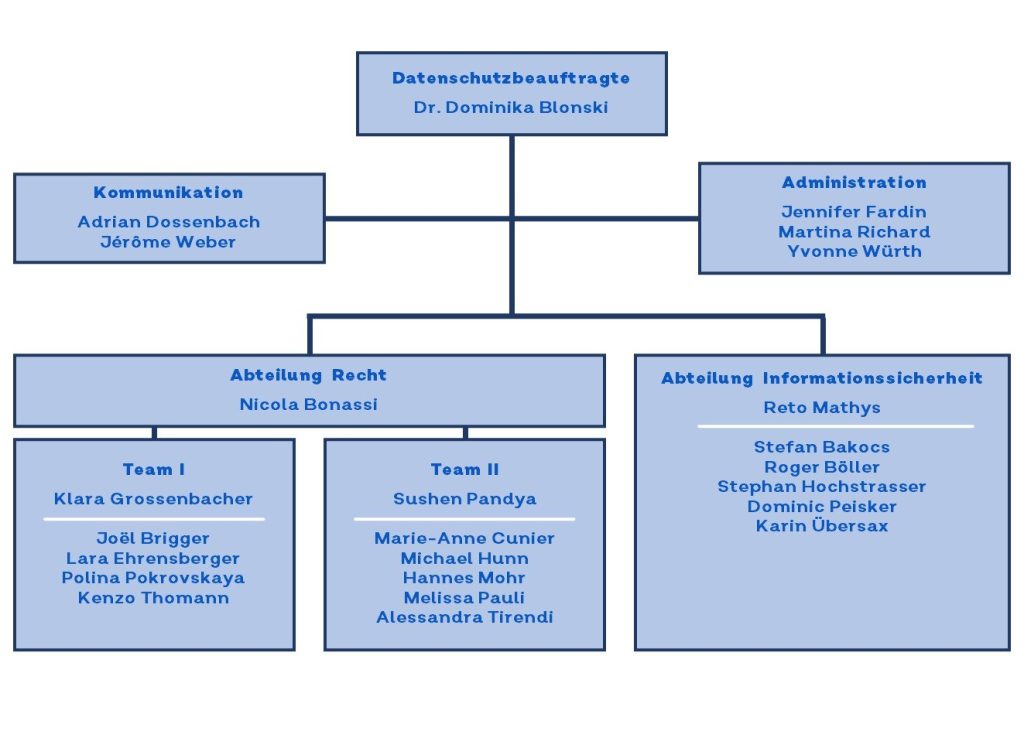 Das Team der Datenschutzbeauftragten besteht aus 22 Mitarbeitenden aus den Bereichen Rechtswissenschaft, Informationssicherheit Kommunikation und Administration.