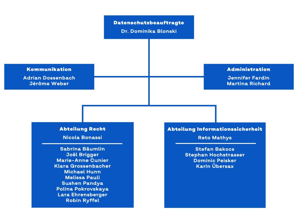 Das Team der Datenschutzbeauftragten besteht aus 20 Mitarbeitenden aus den Bereichen Rechtswissenschaft, Informationssicherheit Kommunikation und Administration.