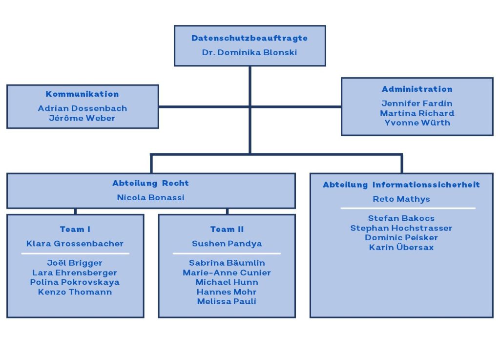 Das Team der Datenschutzbeauftragten besteht aus 22 Mitarbeitenden aus den Bereichen Rechtswissenschaft, Informationssicherheit Kommunikation und Administration.